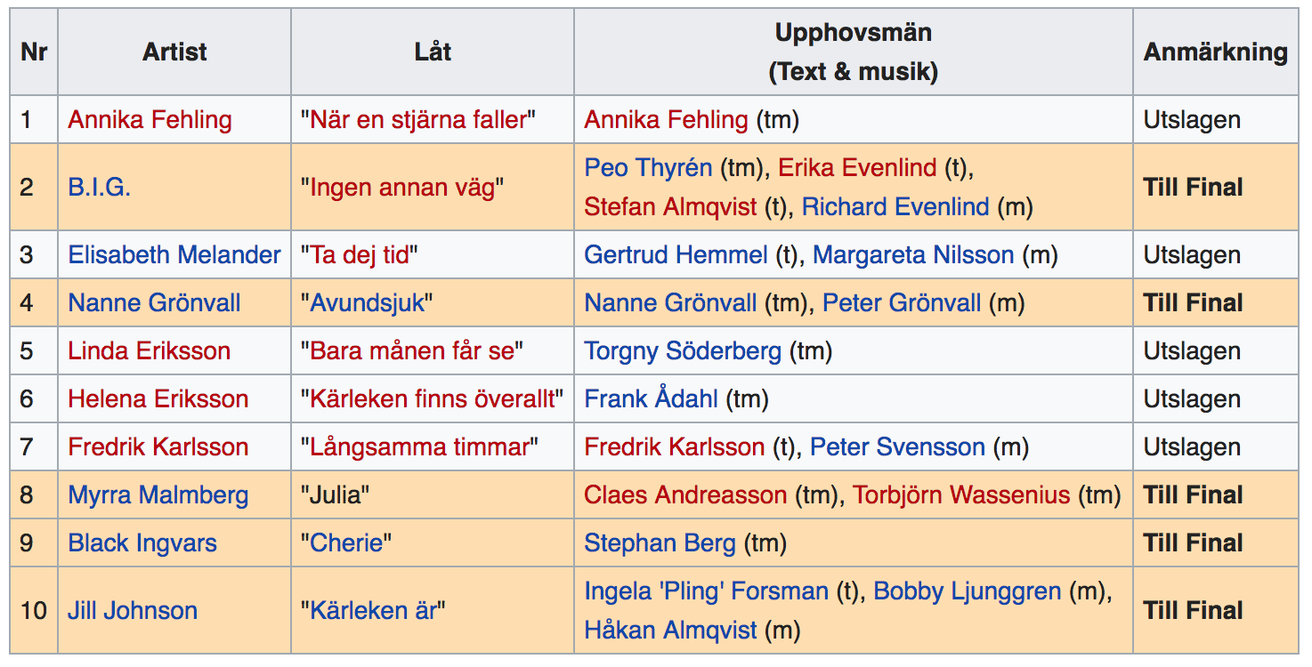 För dig som mot förmodan inte förstår vad jag menar (jag vet ju att vi har väldigt smarta läsare, men ni kanske har någon ni vill dela detta med, så jag vänder mig direkt till hen) så låt mig försöka förklara detta för dig genom att använda några exempel från Melodifestivalen Mello för exakt 20 år sedan. Ni som tycker det var bättre förr minns kanske hur den finalen såg ut, men annars bjuder jag på en liten tabell lånad från Wikipedia här: