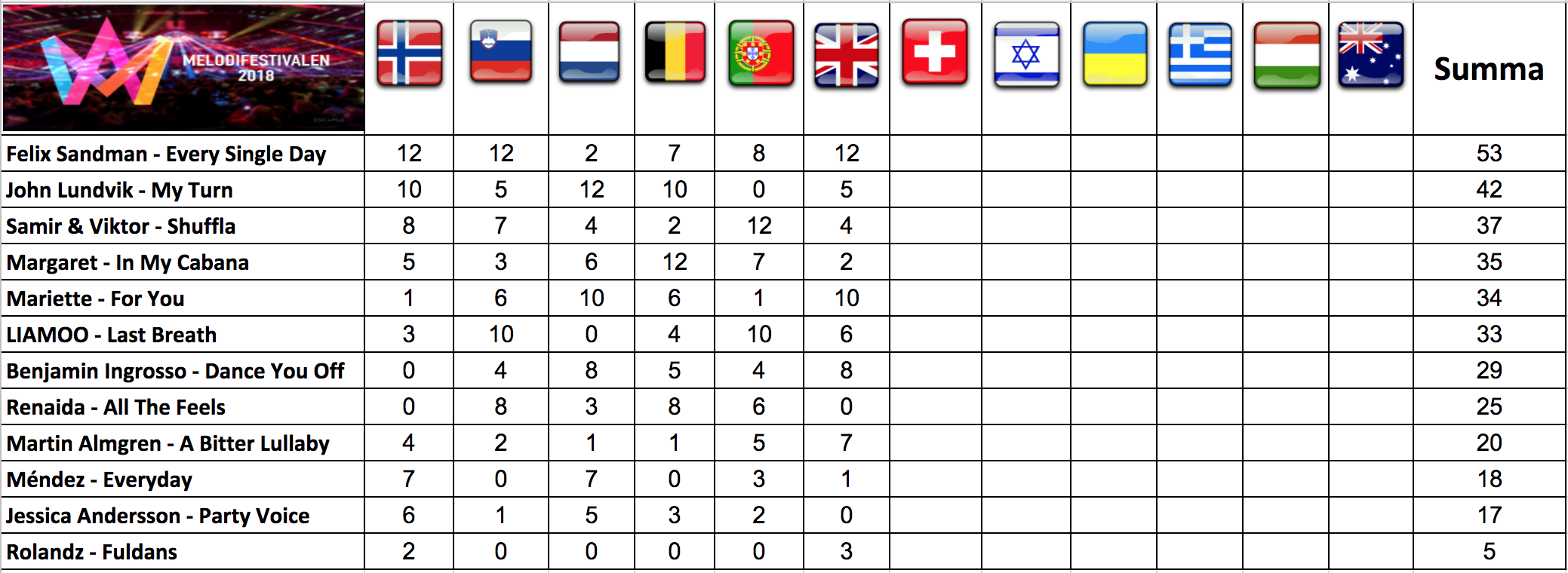 – Jag vet inte riktigt hur juryförfarandet går till och jag gissar att många röstar på låtar de gillar snarare än att de är tänkta att gå bra i Eurovision. Men med tanke på att syftet är att det ska gå så bra som möjligt så tror jag så här. FELIX SANDMAN är antagligen det mest intressanta valet. Han kan balansera ett gripande framträdande med en stark röst och skapa en kontakt med tittaren. Jag är mycket nyfiken på hans röstningssiffror i deltävling 4 jämfört med Mariette och Rolandz. Det tråkiga med detta röstningssätt är att vi förlorar både Renaida och Jessica Andersson – två kul låtar som borde funnits på min lista en vi lever i en värld där kul inte ger röster i dag. Bland annat. Så här röstade jag.