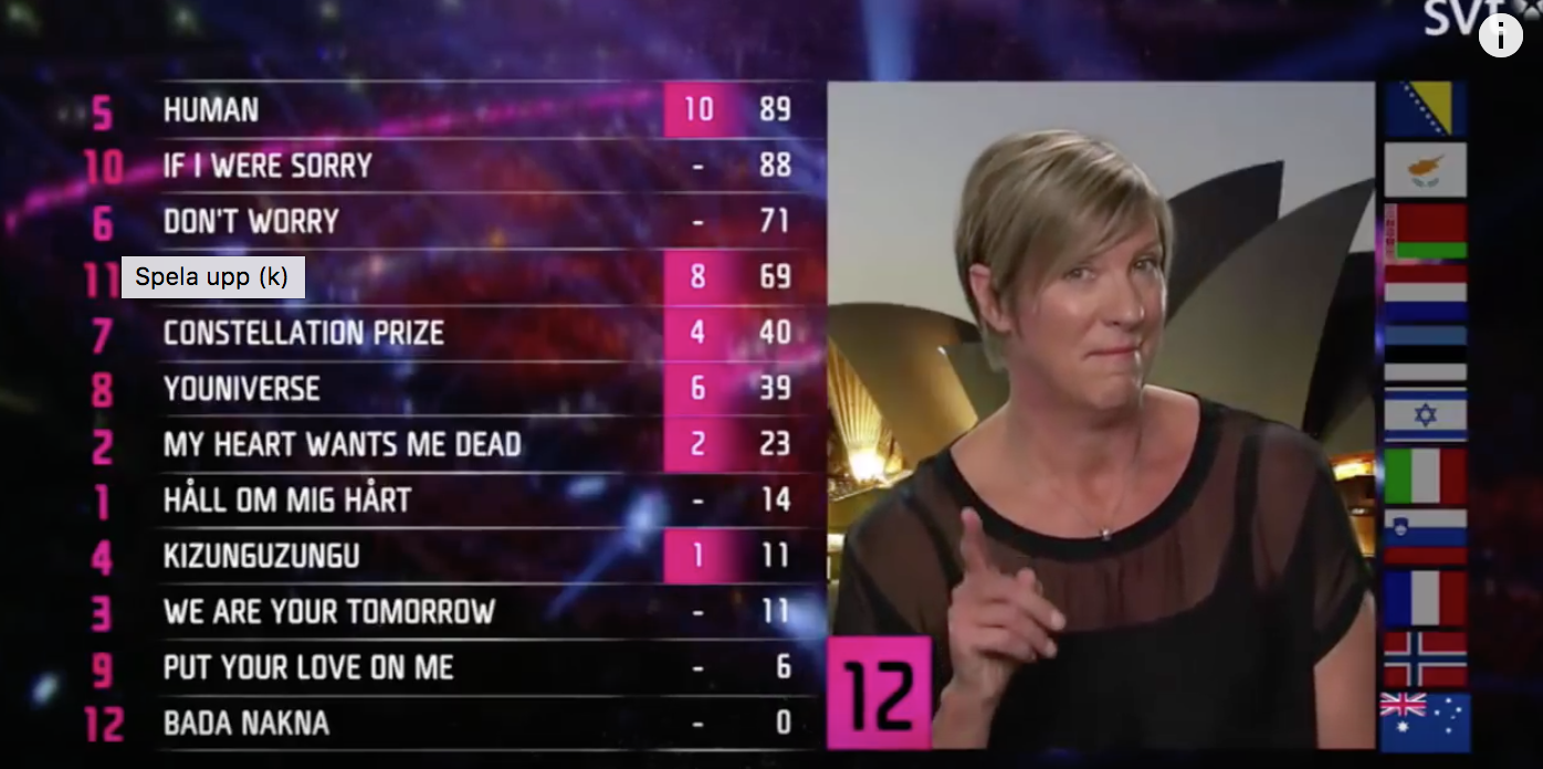 Röstgruppsdebut för landet down under 2016 genom att ge Ace Wilder och Oscar Zia toppoängen. Frans? No thanks mate blev svaret och landet gav den blivande ESC-femman en stor fet nolla (vilket de även gjorde i Eurovision…)  Wiktoria fick i alla fall 8 p och Lisa Ajax 2 poäng detta år.
